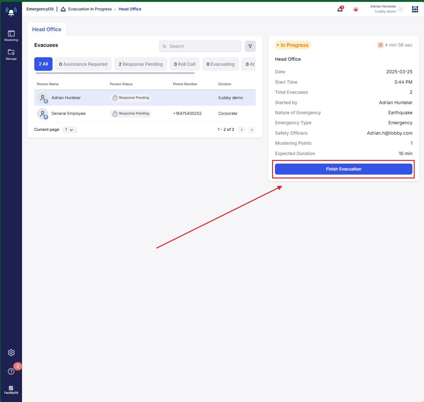 Note: The ability to start and end evacuations via the iLobby or EmergencyOS mobile companion apps is limited to customers in the corporate tier of EmergencyOS.