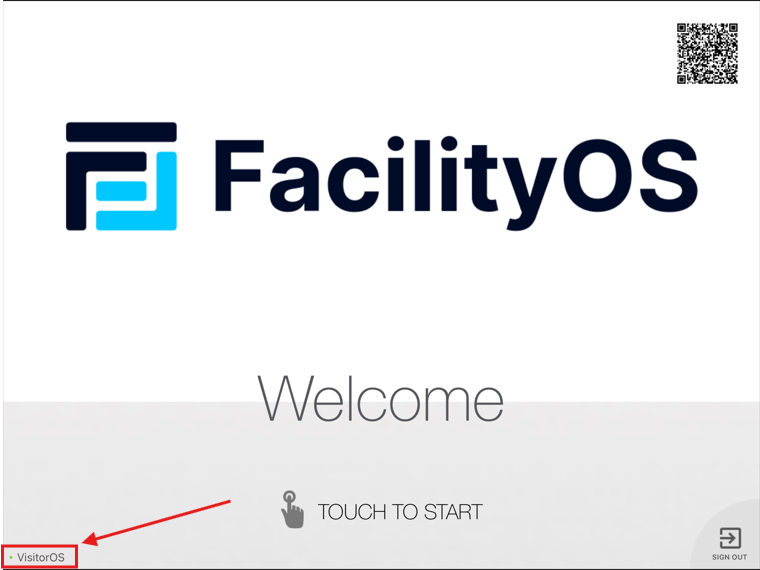 1. Select the VisitorOS text logo in the bottom-left corner of the welcome screen, as shown below. This will launch the beginning of the emergency evacuation procedure once you enter your PIN code in the next step.