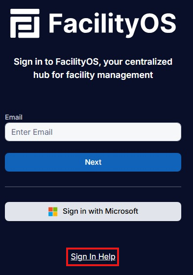 However, if you were added as a user but did not receive the email to set your password, you can get it re-sent to you via the “Sign-in Help” button on the FacilityOS portal sign in page at Login | FacilityOS: