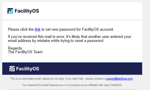 If the email address exists in the FacilityOS account that you are trying to log into, you will receive an email that will allow you to set your password and log into the FacilityOS portal: