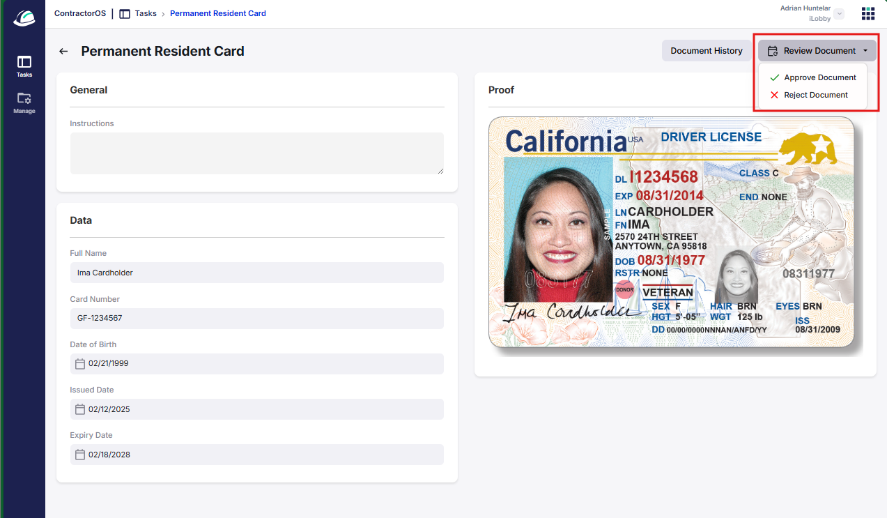 - In the top-right corner, you can select Approve Document or Reject Document, as shown below. You will be prompted to include a note if you are rejecting a task. The Visitor or Contractor who completes the task can see any notes you add to the task when approving/rejecting.