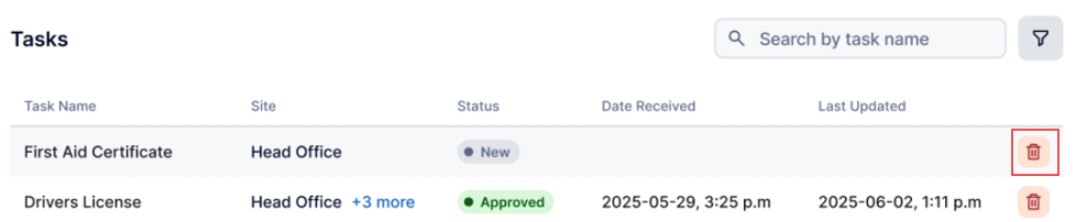 - In the Tasks list, select the task for deletion by selecting the relevant trashcan icon