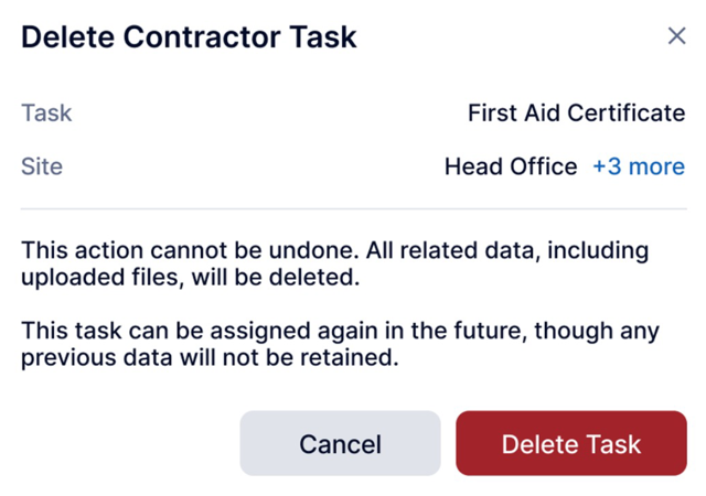 Important: Deleting a task permanently removes all related data, including uploaded documents. This action cannot be undone.