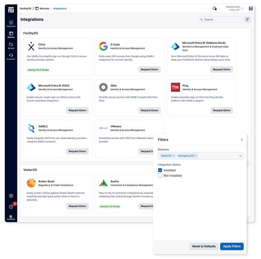 FacilityOS now includes a dedicated Integrations Catalog, making it easier for customers to discover, evaluate, and request supported integrations.